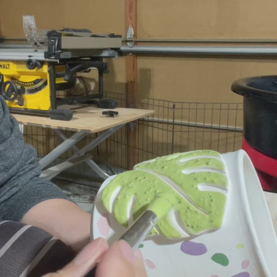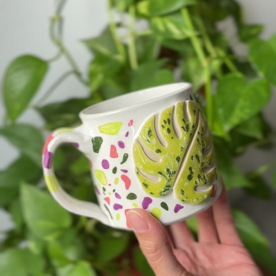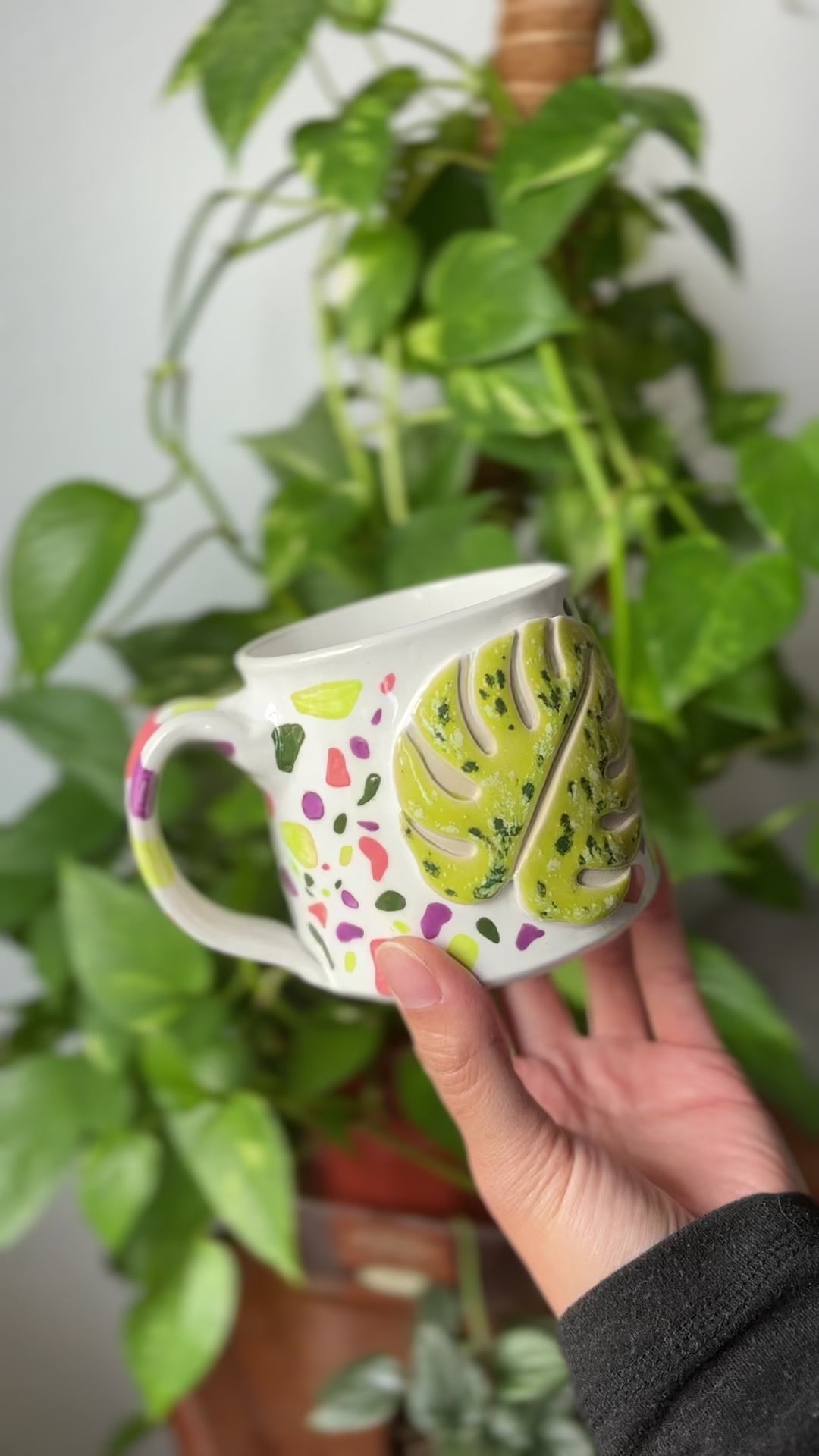 Approx 10 oz (filled to the brim) hand thrown, stoneware mug featuring a monstera relief and hand painted terrazzo spots.